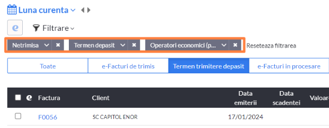 Este o subcategorie a e-Facturilor de trimis. Dintre acestea, aici sunt afisate doar documentele a caror data de emitere depaseste termenul legal de 5 zile lucratoare. In acest fel, vei putea identifica e-Facturile pe care nu le-ai trimis la timp.