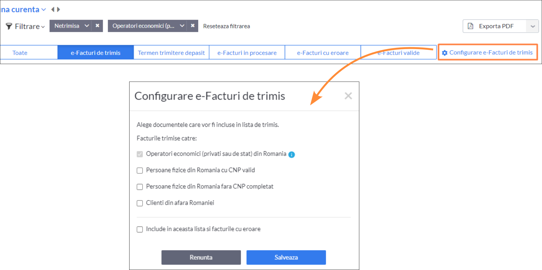 Daca ai drept de administrator, poti configura conditiile de afisare pentru acest filtru. Optiunea din partea dreapta, Configurare e-Facturi de trimis, iti permite sa stabilesti categoriile pentru care se va lua in considerare trimiterea.