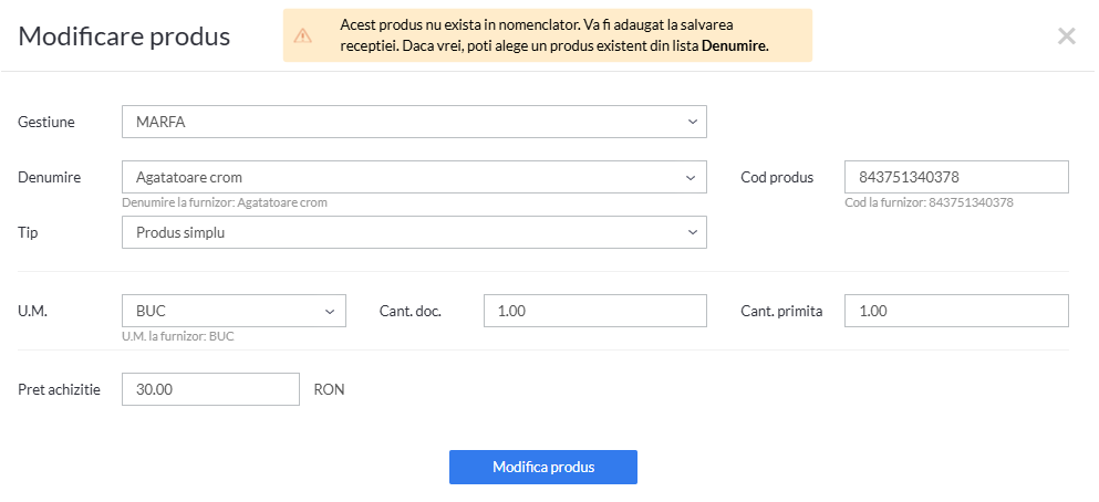 Avertizarea marcheaza un produs pe care aplicatia nu il recunoaste. Poate fi vorba de un produs nou sau de situatia in care identificatorii produselor nu sunt comuni. De exemplu, nu aveti coduri de produs identice, iar aplicatia interpreteaza codul furnizorului ca un produs nou.