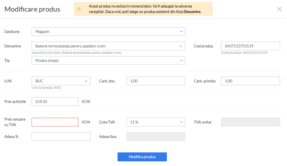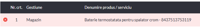 In fereastra de vizualizare/modificare a produsului marcat cu eroare se afiseaza un mesaj cu detalii, iar campul in care trebuie completate informatii are conturul marcat cu rosu. Dupa completarea informatiilor solicitate, eroarea nu mai este semnalata.