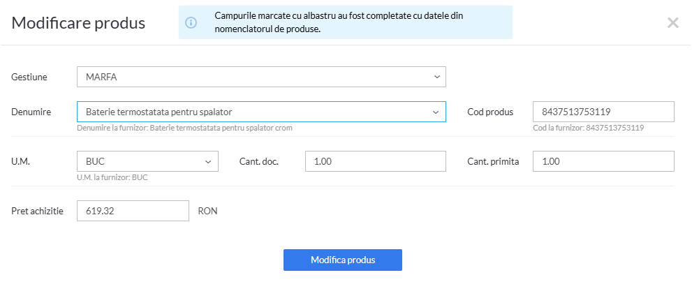 In fereastra de vizualizare/modificare a produsului marcat date inlocuite se afiseaza un mesaj cu detalii, iar campul in care a fost inlocuita informatia este marcat cu albastru. Sub campul respectiv este afisata si informatia asa cum se regaseste pe documentul furnizorului.