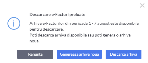 - Apasa Descarca e-Facturi preluate pentru a obtine arhiva. O fereastra este afisata si poti confirma descarcarea acesteia in calculator. In aceeasi fereastra exista si butonul Genereaza arhiva noua. Daca il folosesti, se va crea o arhiva noua, iar cea veche va fi stearsa.