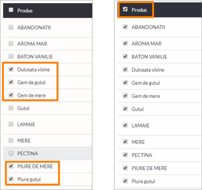 - Selecteaza produsele din lista: individual (prin bifarea casutei din dreptul lor) sau in masa (prin bifarea casutei din capul tabelului). Doar produsele selectate vor fi afectate de actiunea de modificare. Nu uita ca poti folosi filtrarile pentru a afisa doar produsele care te intereseaza;