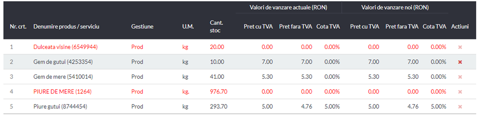 - In cazul in care ai produse fara pret de vanzare definit (sau fara cod de produs in cazul in care folosesti), ele o sa apara in lista cu rosu. Acestor produse nu le poti aplica modificarea cotei TVA, inainte de a le completa pretul de vanzare. Daca doresti, poti sa le stergi din lista de la x-ul rosu de pe ultima coloana.