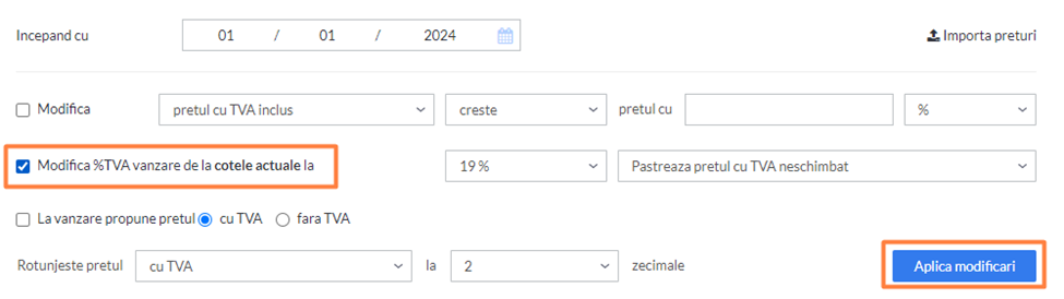 - Daca ai selectat o singura valoare a cotei TVA atunci acea valoare va aparea aici (ex. Modifica %TVA la vanzare de la 19%), daca nu, se va folosi formularea Modifica %TVA la vanzare de la cotele actuale la.