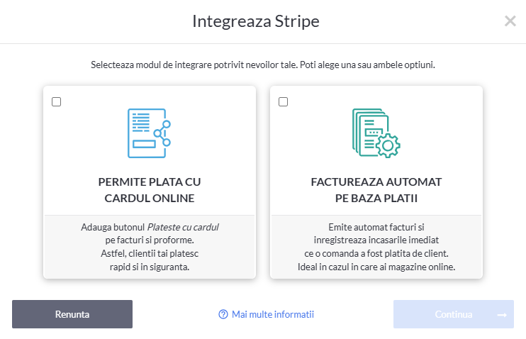 Integrarea cu Stripe este posibila doar daca nu esti integrat deja cu Netopia sau EuPlatesc. Daca unul dintre acestea este activ, se afiseaza fereastra care iti permite sa continui cu Stripe sau sa ramai cu procesatorul de plati existent.
