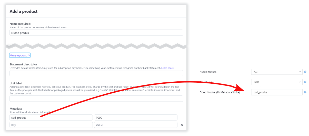 In datele produsului inregistrat in Stripe, la Metadata, poti adauga informatii asociate acestuia. Recomandam ca aici sa completezi codul de produs daca folosesti acest atribut si in SmartBill. In campul Key, completezi tipul informatiei, iar in campul Value codul produsului.