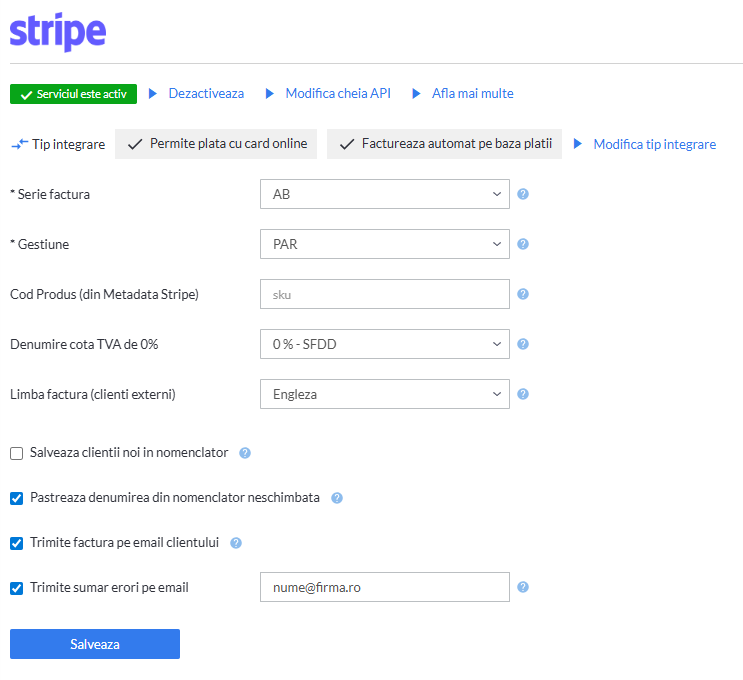 - Trimite sumar erori pe email: daca completezi o adresa de email si apar erori la facturare (nu se poate genera o factura), primesti un email cu toate problemele constatate in ziua precedenta. In email, pe informatii despre plata (client, valoare, moneda), gasesti motivul pentru care nu s-a emis documentul si identificatorul tranzactiei din Stripe.