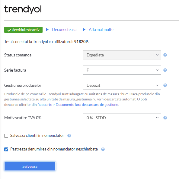 Cat timp serviciul este activ, se afiseaza si optiunea Deconecteaza care dezactiveaza integrarea. Daca ai deconectat integrarea, pentru reactivare trebuie sa reintroduci ID Trendyol si cheile API.