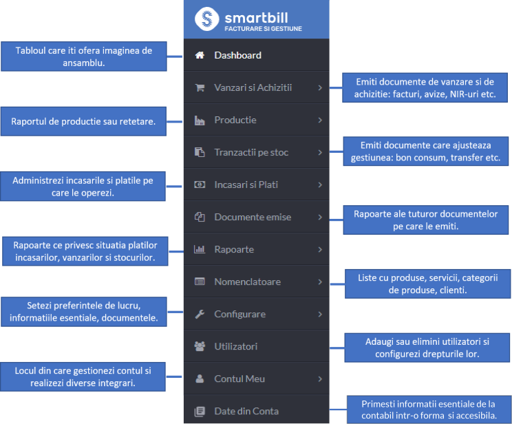 Ai la dispozitie un ghidaj general in aplicatie, dar si pentru doua dintre cele mai importante facilitati ale SmartBill: