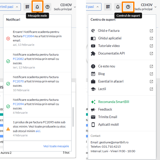 In partea centrala a antetului aplicatie (vizibil indiferent de pagina SmartBill in care te afli), se afla doua butoane extrem de utile: