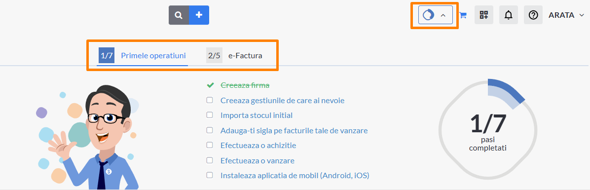 Pe masura ce sunt parcursi pasii, este indicat progresul pe care il ai in invatarea SmartBill.