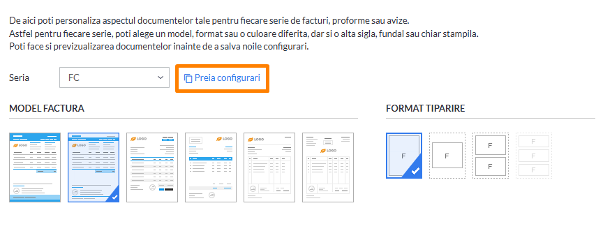 Exista si posibilitatea de a importa setarile de pe o alta serie deja personalizata, prin optiunea Preia configurari. Aceasta se afla in pagina Configurare > Personalizare, in dreptul campului Serie. Din fereastra care se deschide de la aceasta optiune, se poate selecta seria ale carei caracteristici vrei sa le pastrezi pe noua serie.