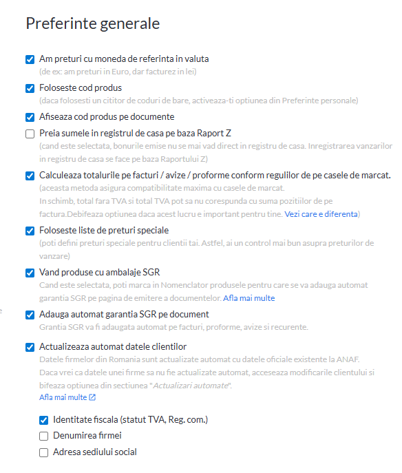 Preferintele generale sunt stabilite la nivelul contului firmei si se aplica tuturor utilizatorilor inregistrati, spre deosebire de cele din Preferinte personale, care sunt specifice fiecarui utilizator..