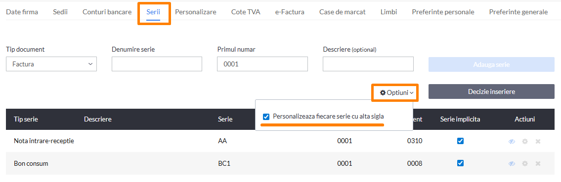 Pentru a modifica modul in care arata facturile emise de acum inainte pe o anumita serie, poti urma pasii: