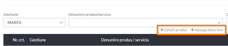 Pe langa informatiile obligatorii, fiecarui produs ii poti adauga detalii specifice, de la descriere la coduri solicitate de ANAF sau de clienti (coduri NC, CPV, identificatori) si la referinte specifice comenzii. Aceste informatii se pot adauga daca apesi pe optiunile +Detalii produs sau +Adauga descriere aflate sub campul Denumire. Informatii suplimentare despre aceste sectiuni in articolul Detaliile si descrierea produsului.