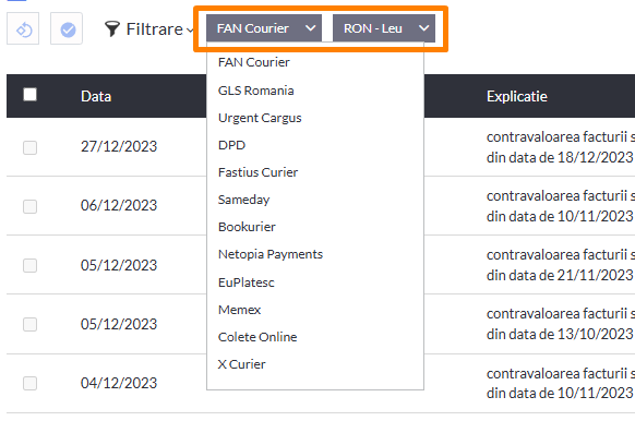 In raport, operatiunile inregistrate (prin import sau manual) sunt afisate in functie de partener (curier/procesator plati) si de moneda. Aceste filtre nu pot fi eliminate, ceea ce inseamna ca nu vei putea afisa in acelasi timp incasari de la doua firme de curierat sau incasari in monede diferite.