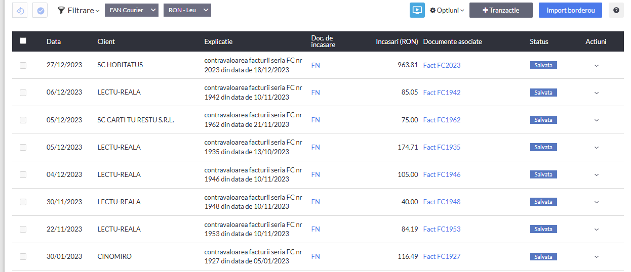 - Import borderou de incasari. Pentru mai multe informatii, vezi Importul borderoului de incasari;