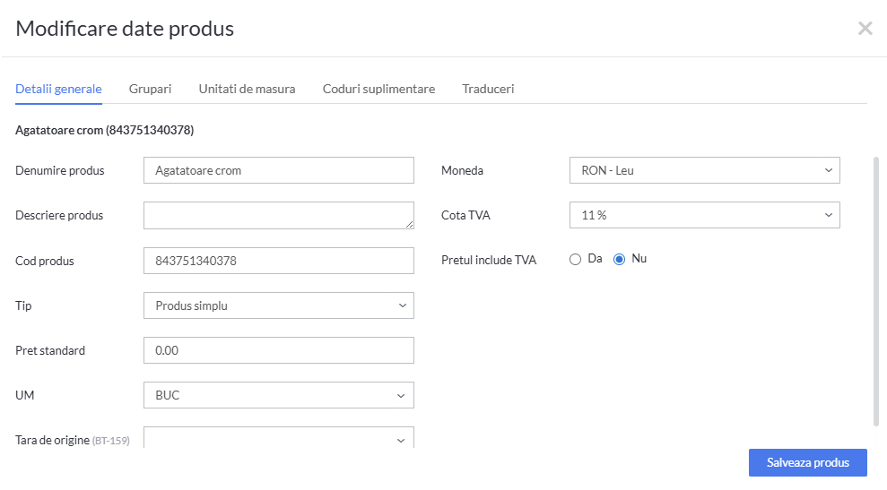 - Cod produs: daca ai stabilit ca folosesti coduri de produs;