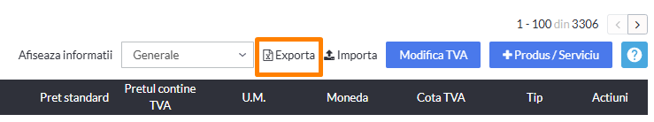 Poti descarca lista de produse inregistrata in nomenclator, alegand optiunea Exporta. Fisierul descarcat este in format Excel si va contine toate informatiile produselor/serviciilor, indiferent de ceea ce vizualizezi (chiar daca ai selectat sa afisezi doar datele generale si doar acestea sunt vizibile in nomenclator, in fisierul Excel se vor regasi si informatiile care se afiseaza la selectarea codurilor si greutatilor).