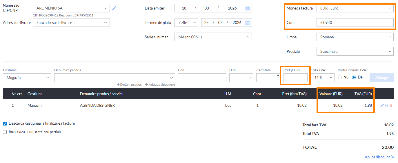 - Folosesti preturi in valuta, dar emiti pentru clienti din Romania, caz in care, la adaugarea produselor pe document, completezi pretul in valuta, dar pe factura valorile sunt exprimate in RON.