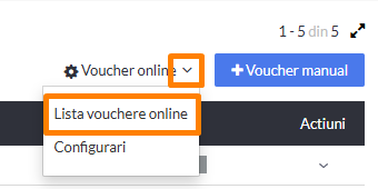 - butonul Voucher online (afisat in partea dreapta sus) si optiunea Lista vouchere online, atunci cand exista deja vouchere manuale emise sau alte vouchere online create. In acest caz, esti transferat in pagina dedicata crearii voucherelor online, pagina care afiseaza butonul +Voucher online in partea dreapta sus.